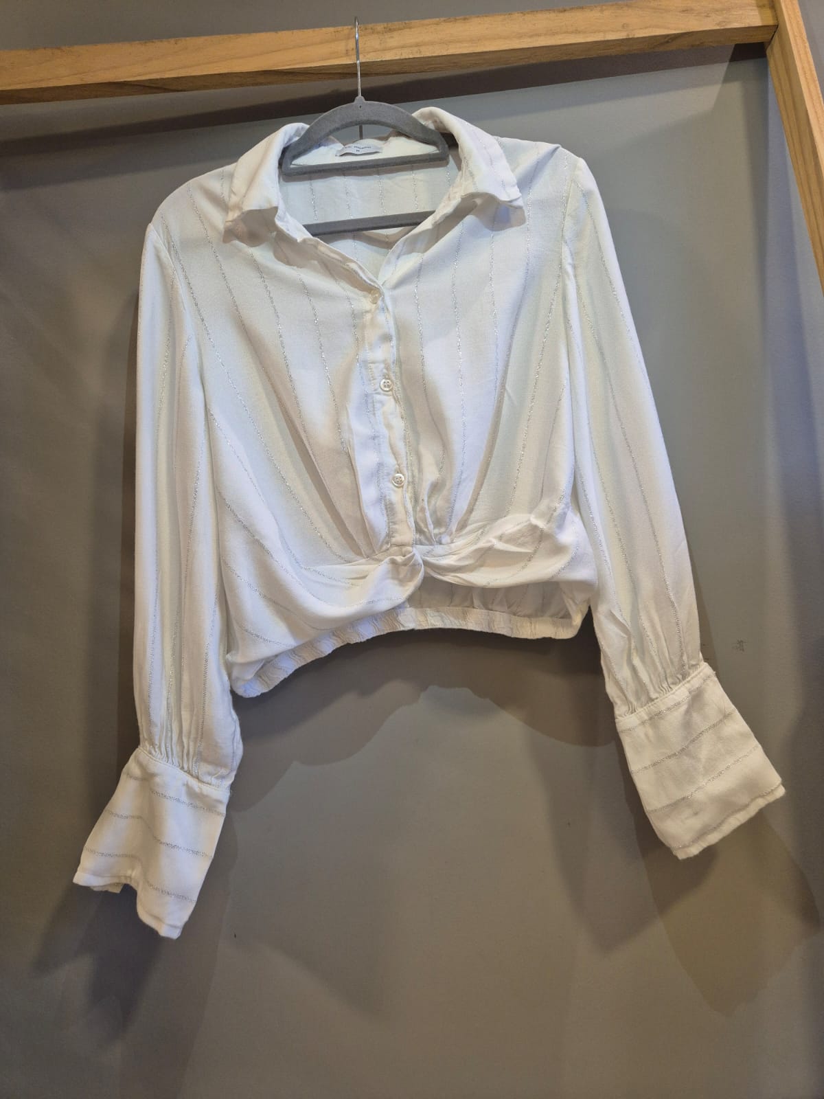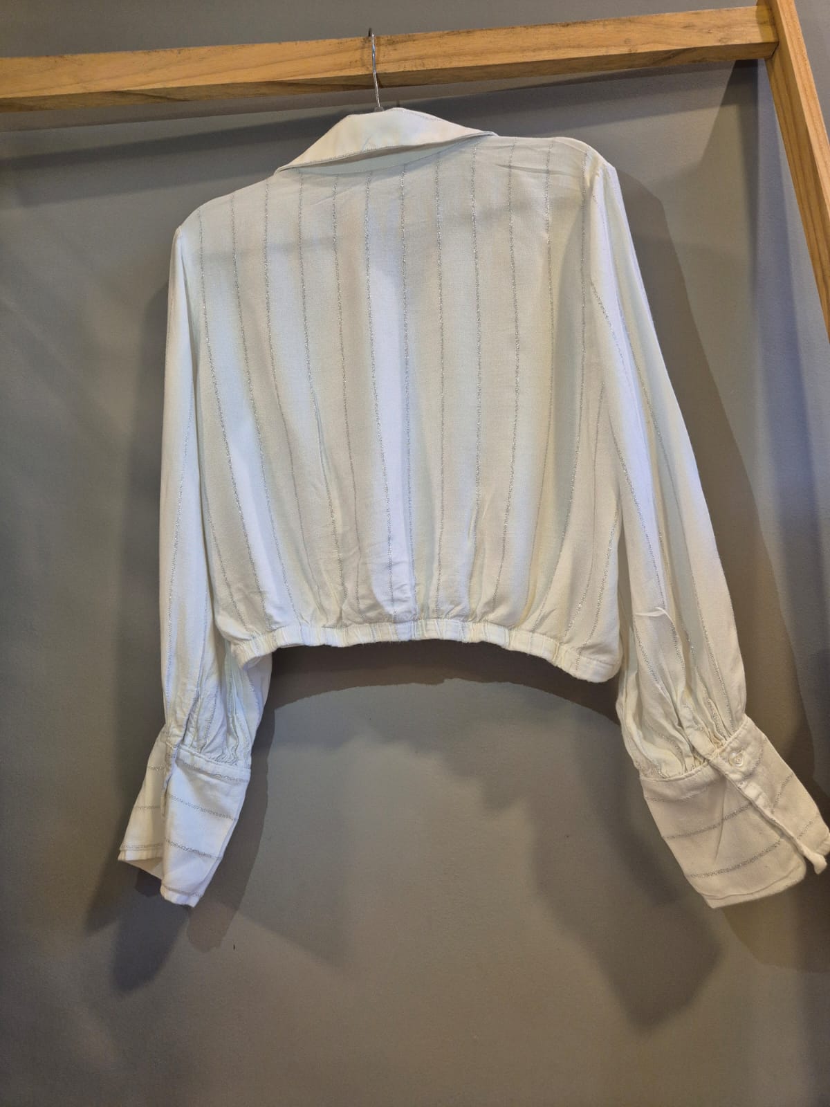 Blusa leve, com fios prata na vertical.
