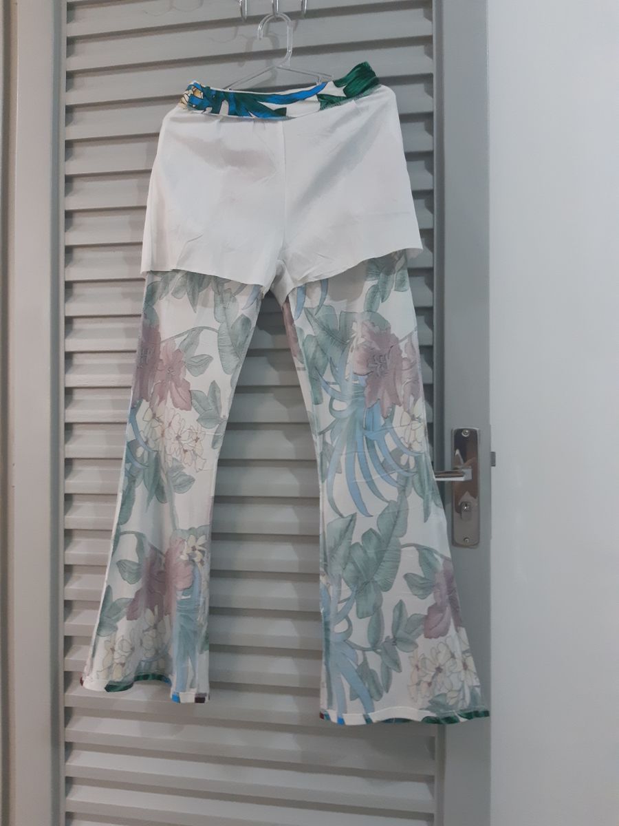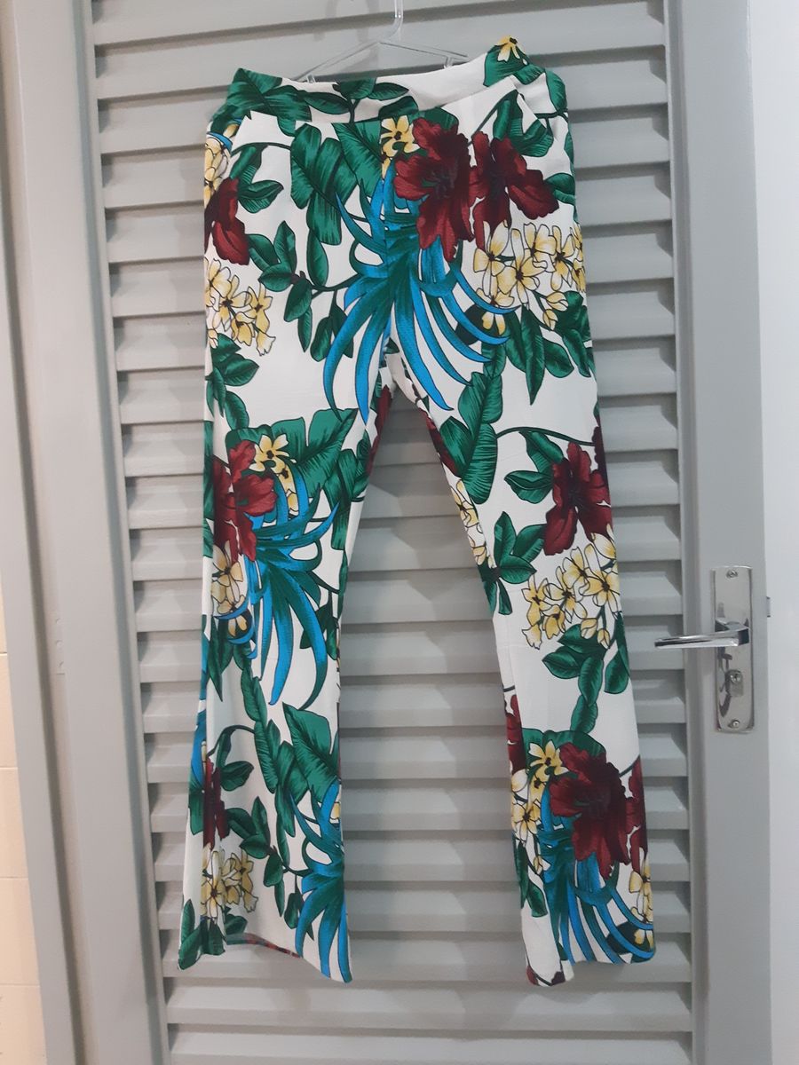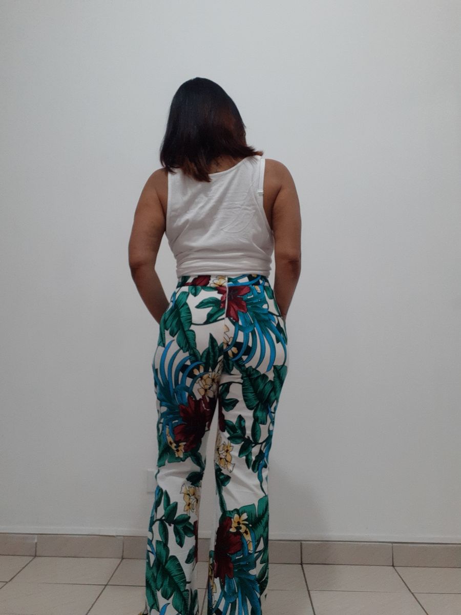 calça flare, viscose com elastano, estampa flores e folhas, bolso faca, tem um forro tipo shorts, zíper invisível na parte de trás, peça usada gentilmente, em perfeito estado de conservação, sem avarias. veste do 38 ao 40 cintura 76 cm quadril 95 cm cavalo 29 cm comprimento 101 cm gratidão